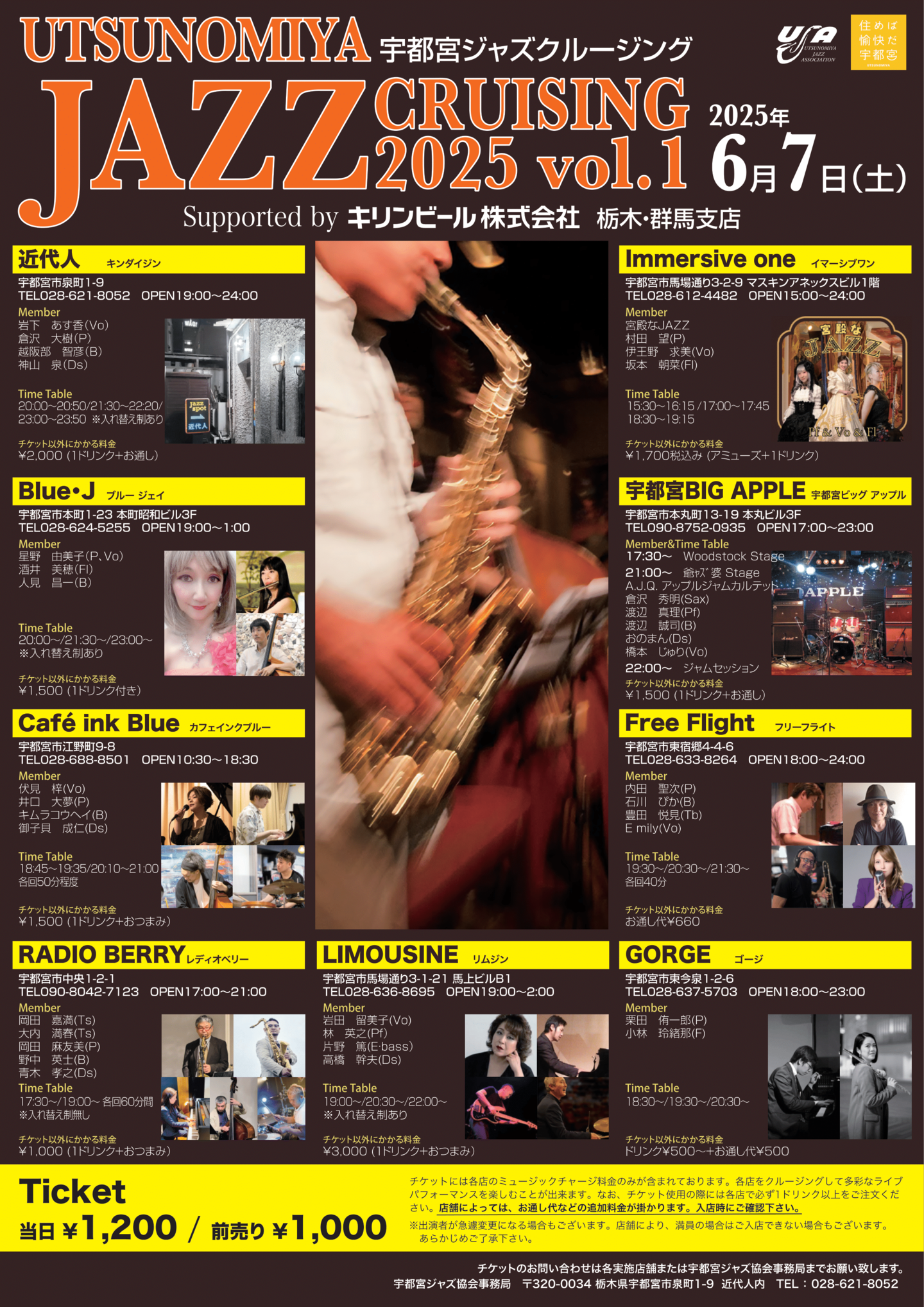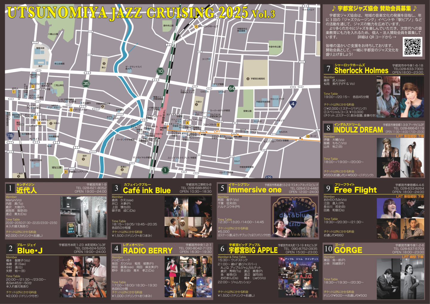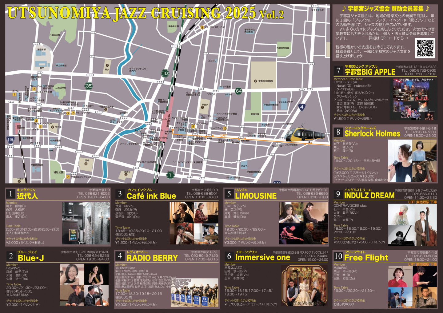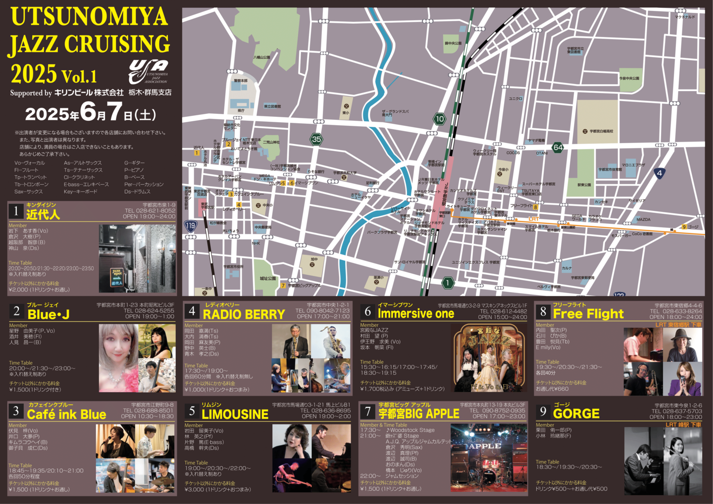 ※演奏スケジュール、演奏者は急遽変更になる場合もございますのであらかじめご了承下さい。宇都宮ジャズクルージング加盟店とジャズクルージング実施店は異なりますのでご注意下さい。