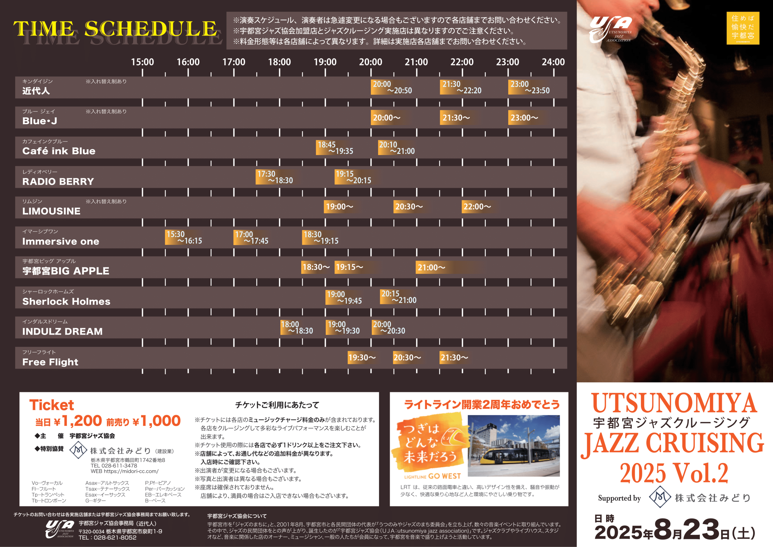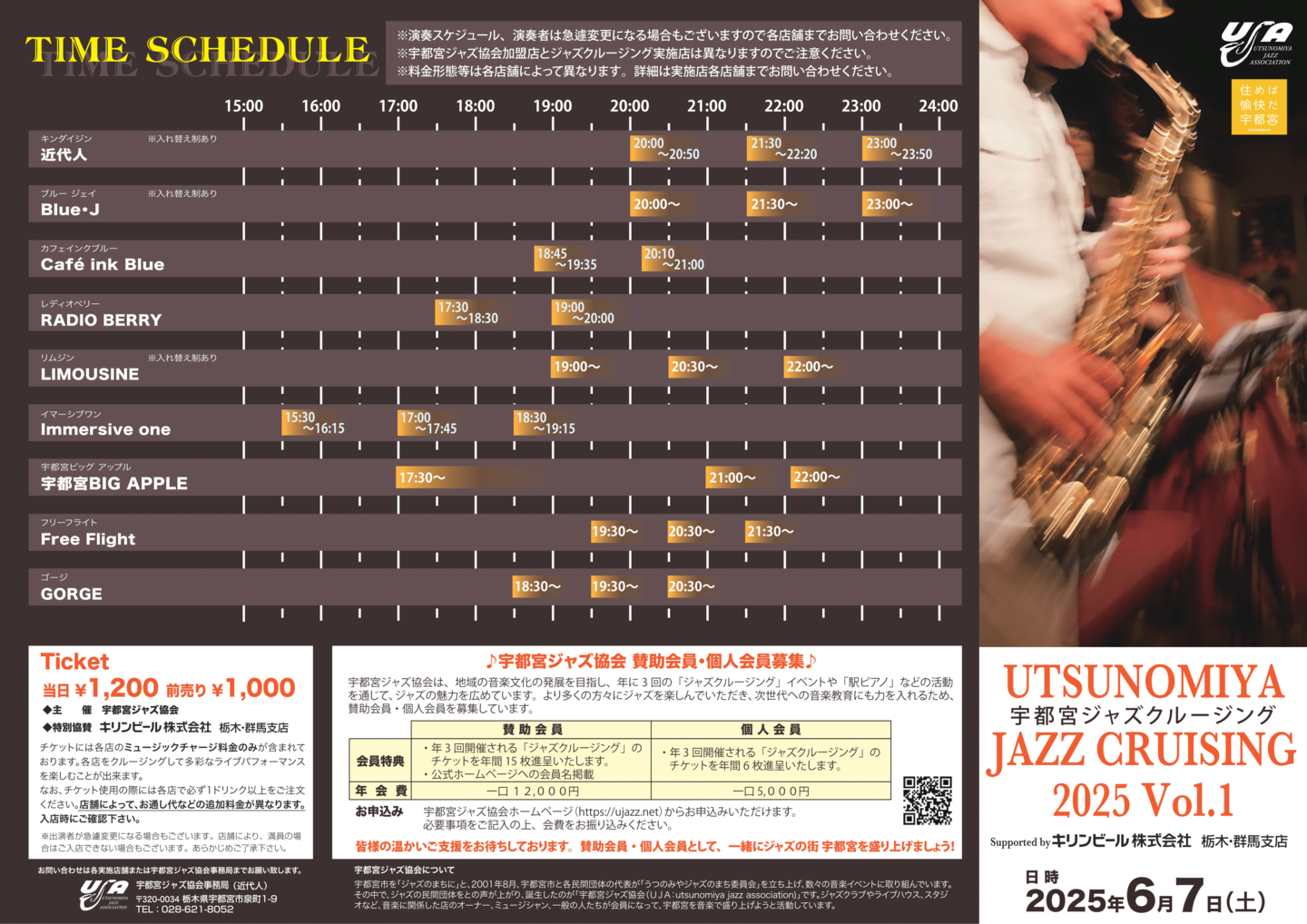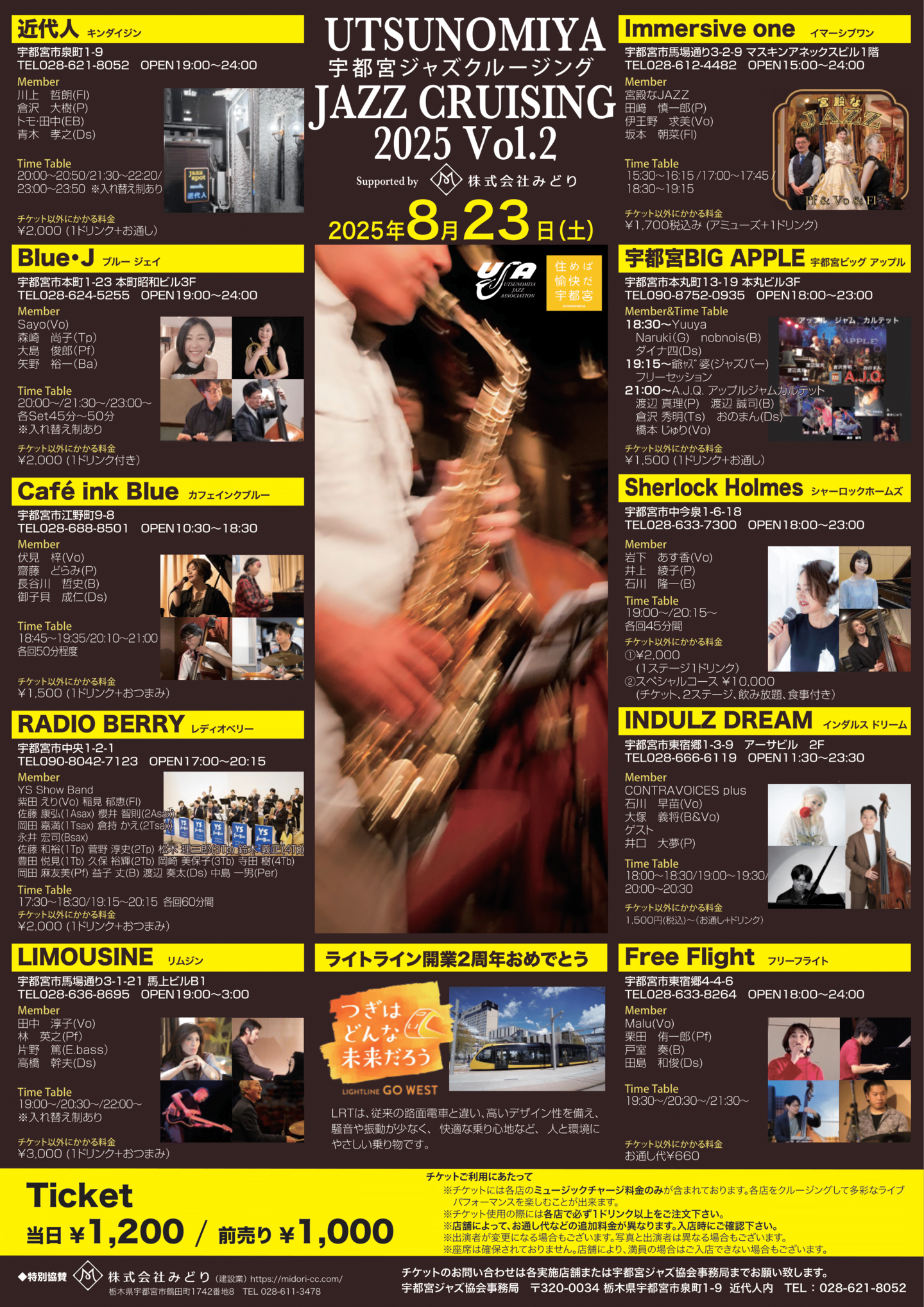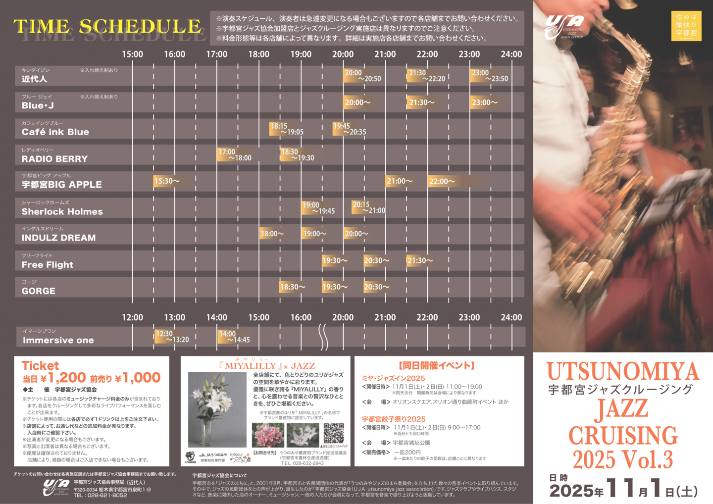 ※演奏スケジュール、演奏者は急遽変更になる場合もございますのであらかじめご了承下さい。宇都宮ジャズクルージング加盟店とジャズクルージング実施店は異なりますのでご注意下さい。